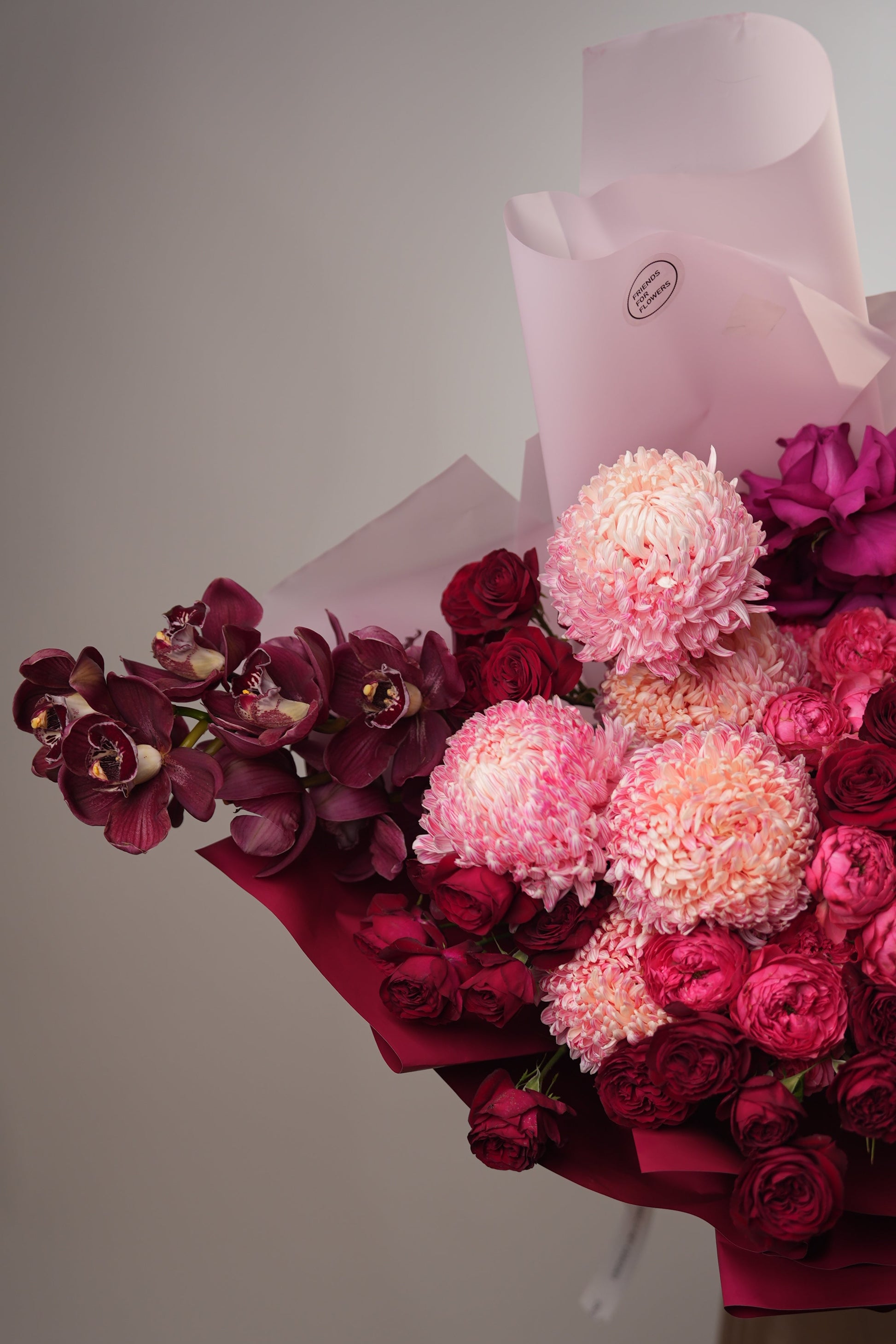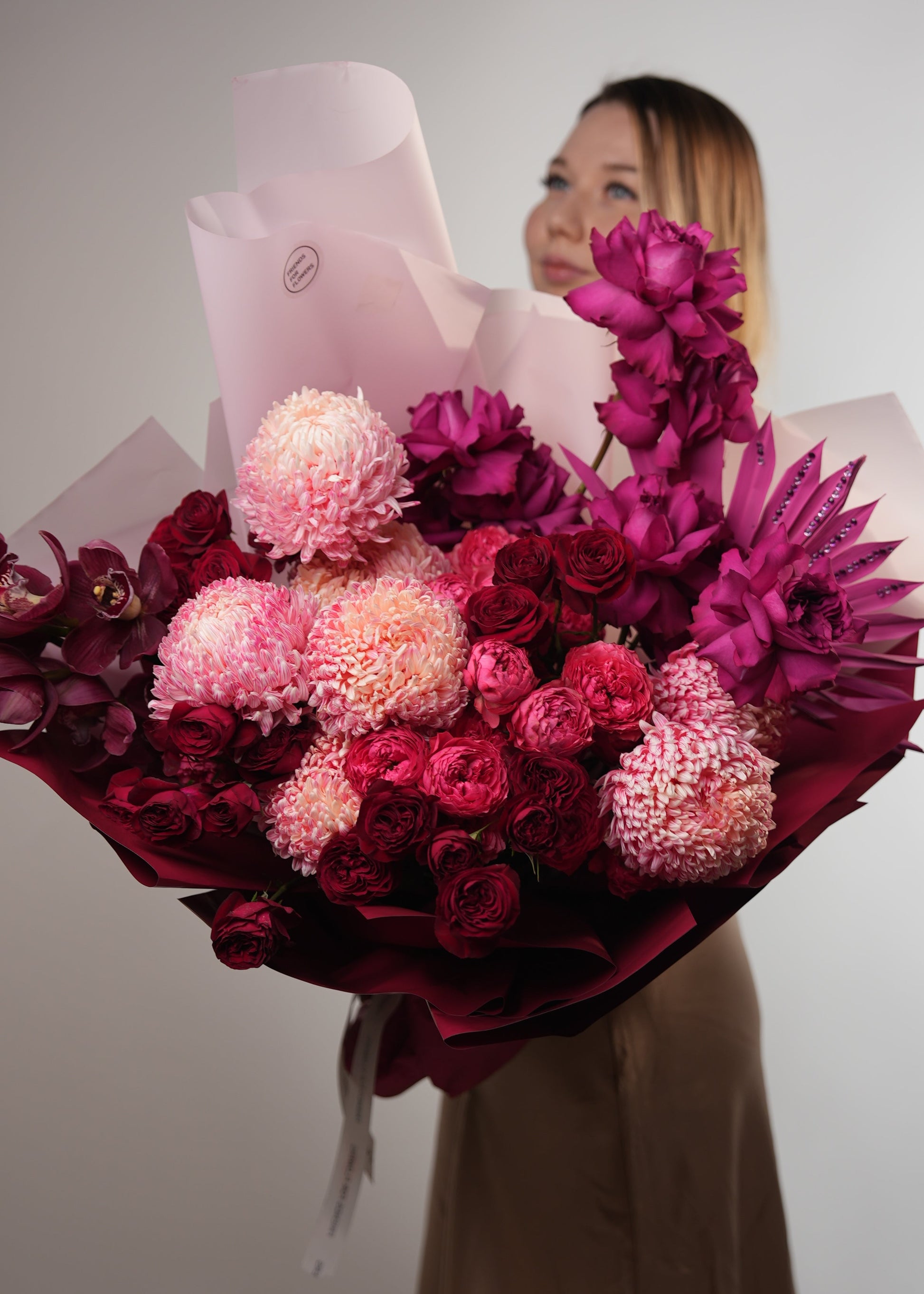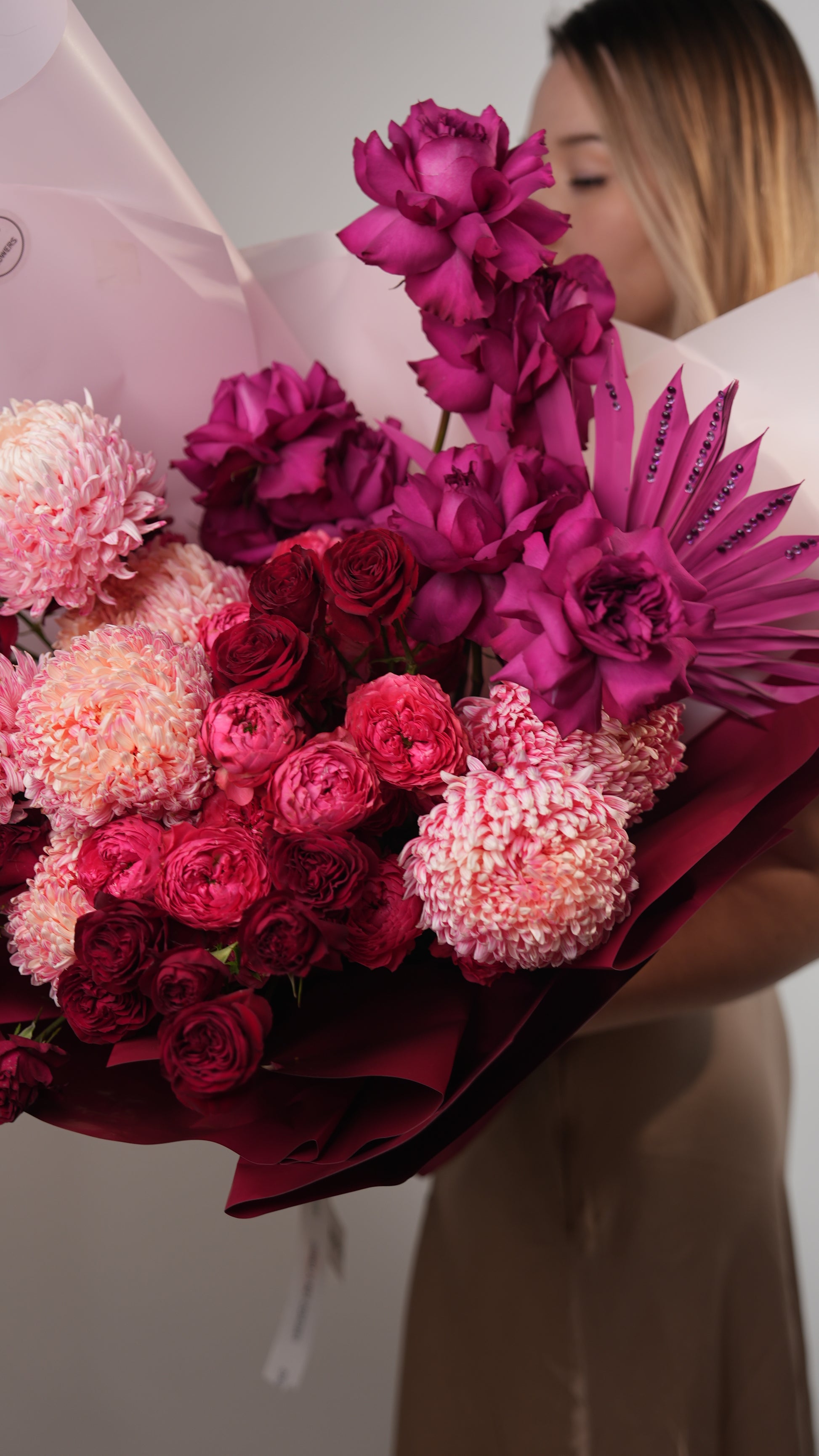 Dramatic floral arrangement in vibrant shades of magenta, deep burgundy, and soft pink. The bouquet is held by a person whose face is partially obscured by the flowers, creating an elegant, focus-on-the-art feel. The flowers are wrapped in a mix of crisp white and deep maroon paper, which enhances the "oversized" and luxurious aesthetic.