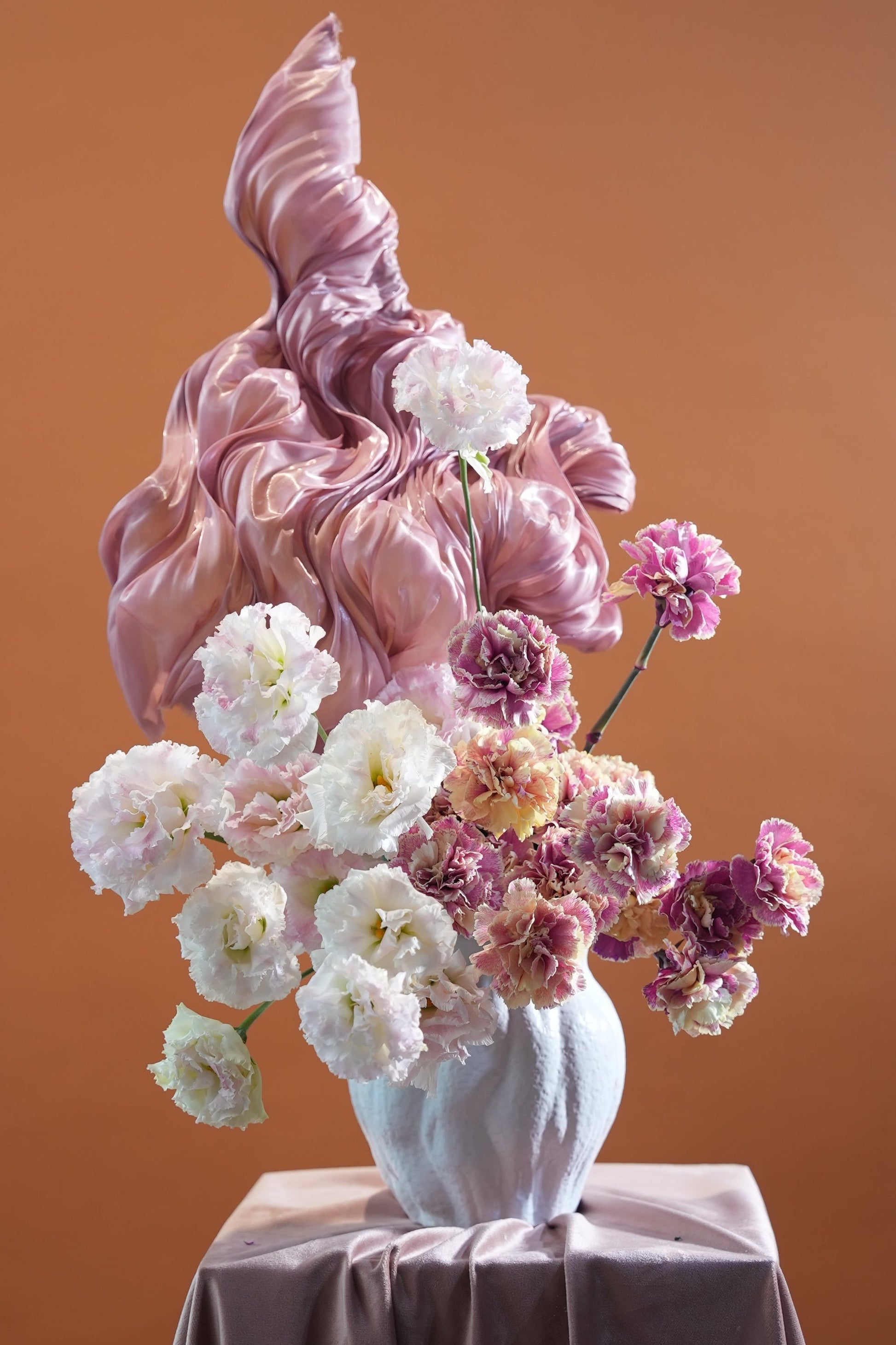 An elegant and artistic floral arrangement featuring a sculptural blush-toned centerpiece paired with soft pastel blooms. Delicate white and dusty pink flowers are thoughtfully arranged in a textured ceramic vase, creating a harmonious balance of softness and structure. Set against a warm neutral backdrop, this arrangement exudes modern sophistication and timeless charm, making it perfect for luxury gifting, intimate celebrations, home décor, or special occasions.