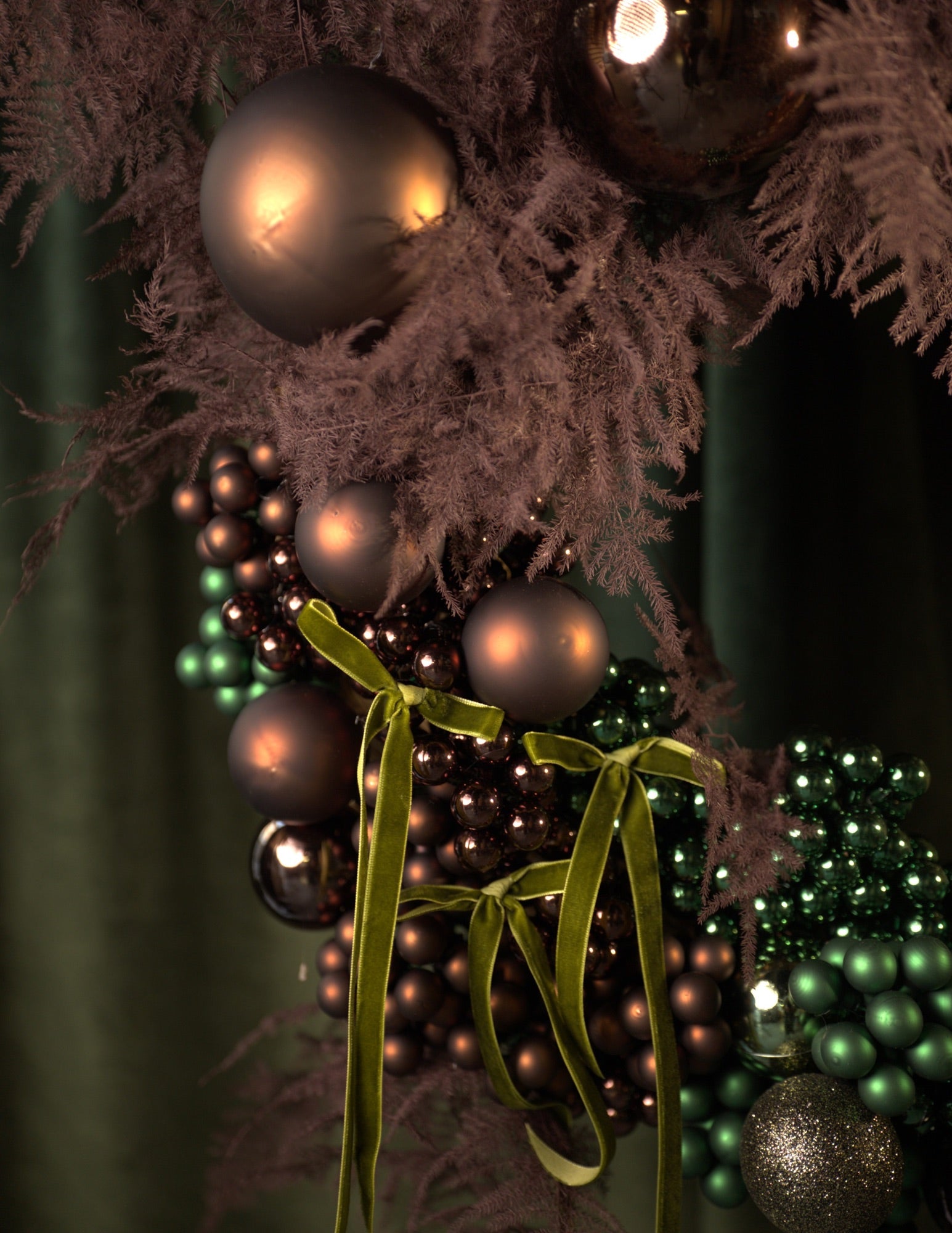 A luxurious and artistic holiday wreath crafted in rich earthy tones and metallic accents. The design features a mix of dried foliage in soft mauve-brown hues, paired with clusters of gold and bronze ornaments. Deep green baubles add contrast and depth, while cascading natural elements on the right side create a dramatic, asymmetrical flow. Subtle touches of greenery and a small golden reindeer figurine give it a festive, elegant character. Set against a deep green velvet backdrop, the wreath stands out as a sophisticated, modern Christmas piece with a natural, organic feel.